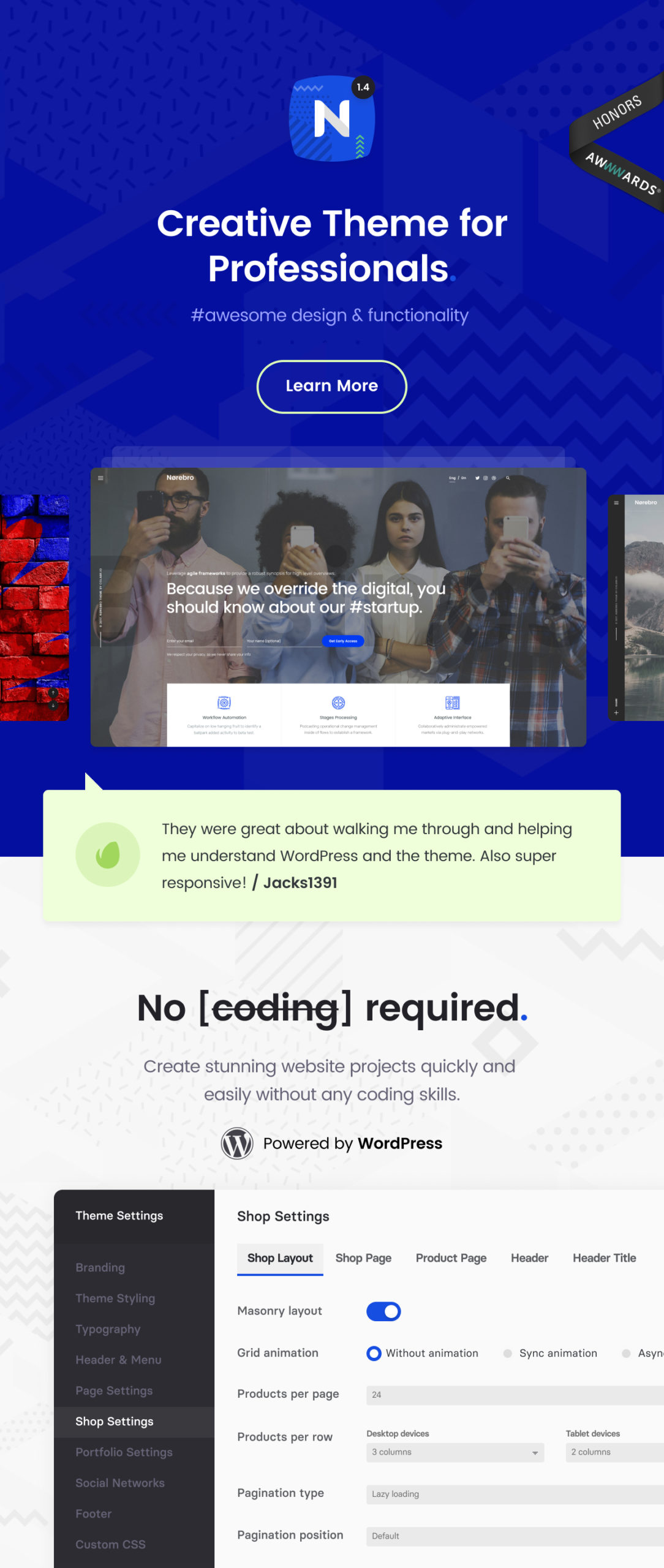 Norebro is a carefully crafted flexible and high performance multi purpose WordPress Theme for personal and corporate use. It comes with the most popular page builder WordPress Visual Composer. Create gorgeous pages and layouts fast and easy without coding.